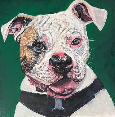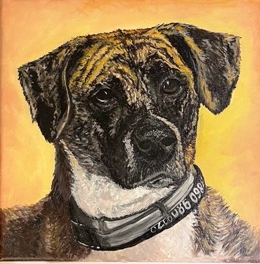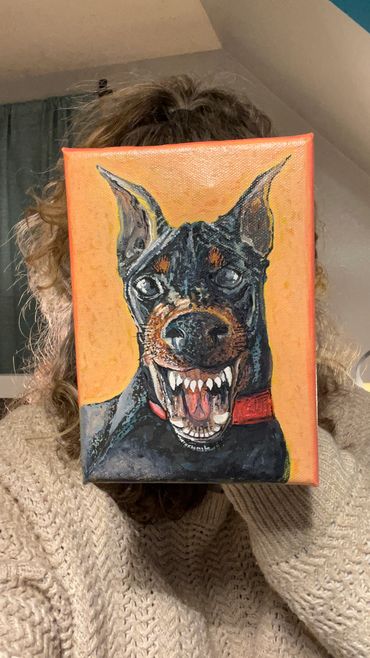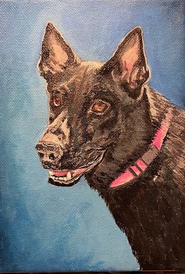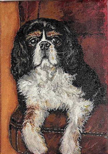 24" x 30" I was asked if I could do portraits, my response was sure I'll give it a go! This commissioned portrait was the most complicated I have ever attempted. My customer wanted to be sitting in the throne with his two dogs shown here. Everything was in the Game of Thrones theme. When the client is happy, I'm happy.