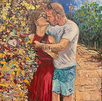 11" x 14" A special commission where a friend requested a painting as a Christmas gift for his girlfriend. This acrylic canvas beautifully illustrates a cherished moment they shared during their travels. The careful attention to detail and emotion in the artwork reflects the love and thoughtfulness behind the gift, making it a heartfelt addition to their home. For the first time, I was using gold foil to highlight the wall of locks in the backdrop.